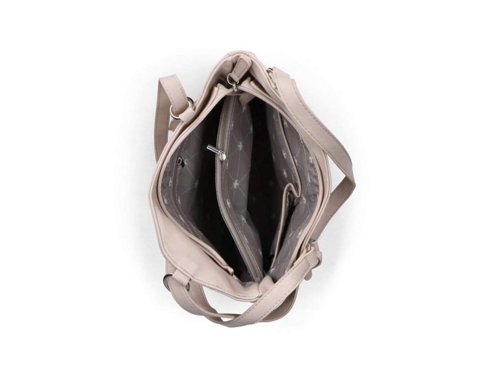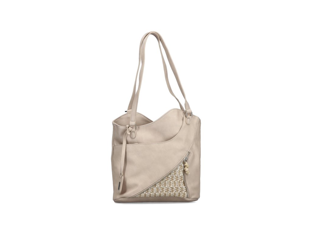 Elegantní dámská kabelka značky RIEKER Vás okouzlí svým asymetrickým provedením a krásným zdobením přední části. Svršek kabelky je díky béžovému provedení a jemnému vzoru v dolním rohu poutavým a přesto decentním kouskem ve Vašem šatníku. Kabelka je zdobená přívěskem s logem značky a na zadní straně praktickou kapsou se zipem. U horního okraje se nachází zip, po jehož rozepnutí se otevře velká kapsa rozdělená praktickou kapsou na zip. Uvnitř kabelky se nacházejí také malé kapsičky vhodné k uložení drobností. Taška má dva delší popruhy pro pohodlné nošení přes rameno nebo upravením lze zvolit variantu batohu. Tento originální kousek vám dodá ten správný šmrnc každý den a variabilní možnosti nošení zajistí jedinečnost tohoto modelu.