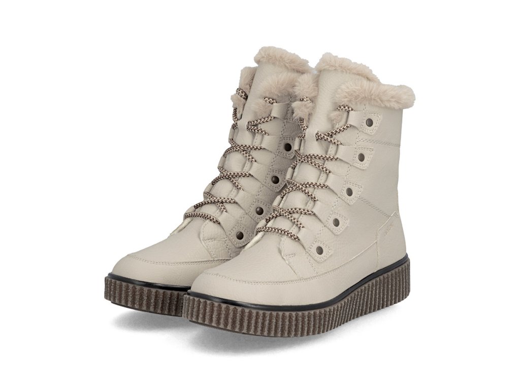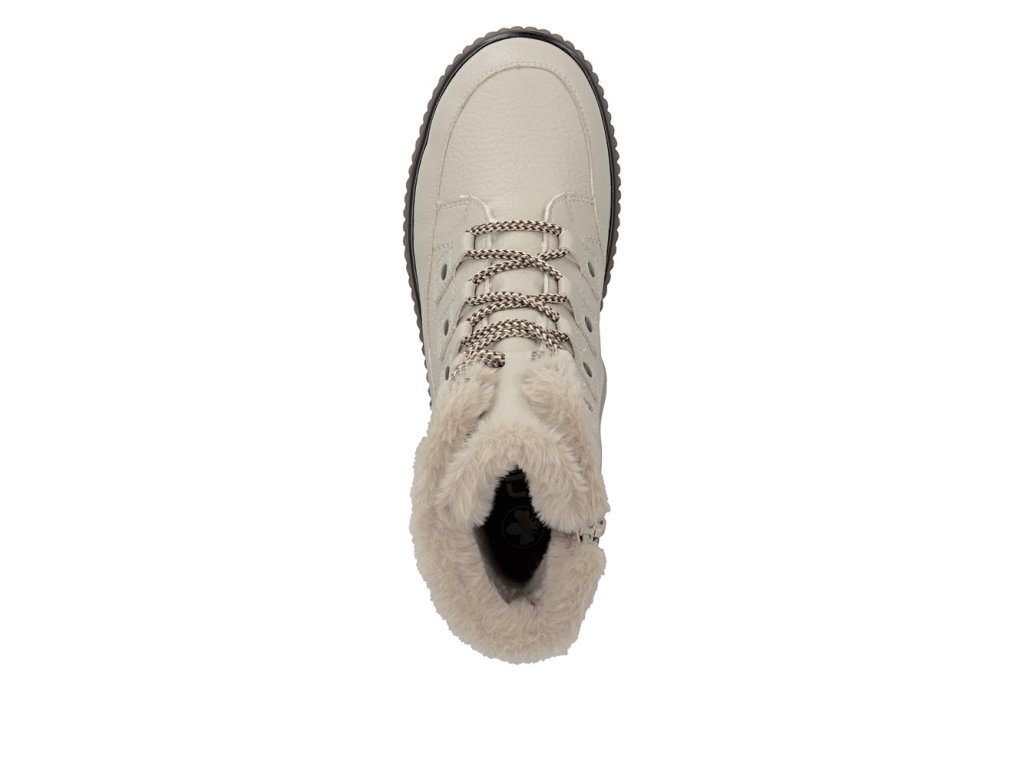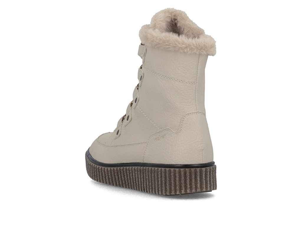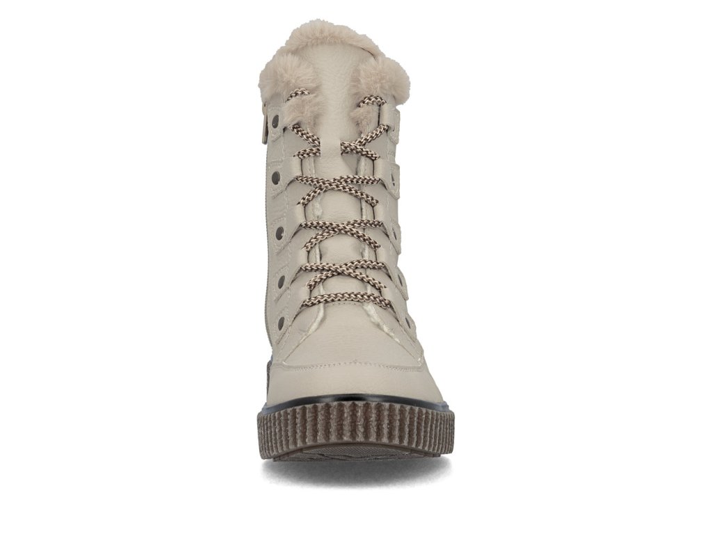 Tyto kotníkové boty značky Rieker svým provedení svršku béžové barvy budou univerzálním obutím zimních dní. Nápaditý akcent je lemování horního okraje kožíškem a linie prošití vytvoří jemnou dekoraci vzhledu. K obutí můžete využít šněrování nebo zip na vnitřní straně boty ideální pro rychlé nazutí. Měkká vyjímatelná stélka, hřejivá podšívka a podešev tlumící nárazy dělají z tohoto modelu ideálního společníka pro zimní procházky i každodenní nošení.