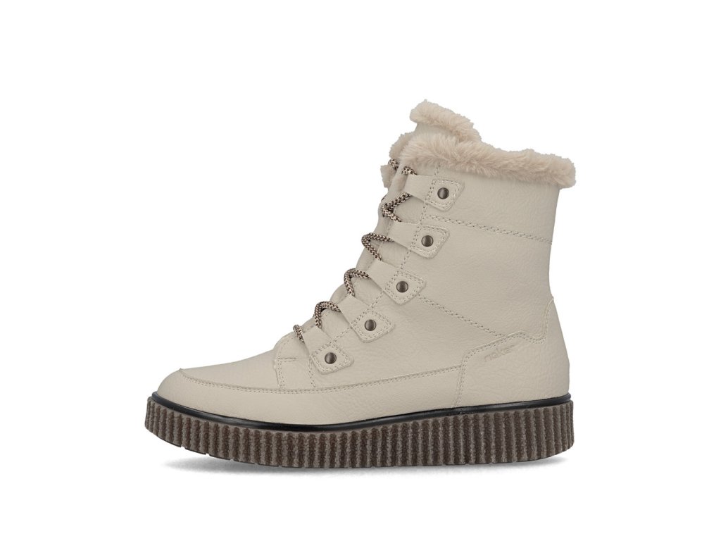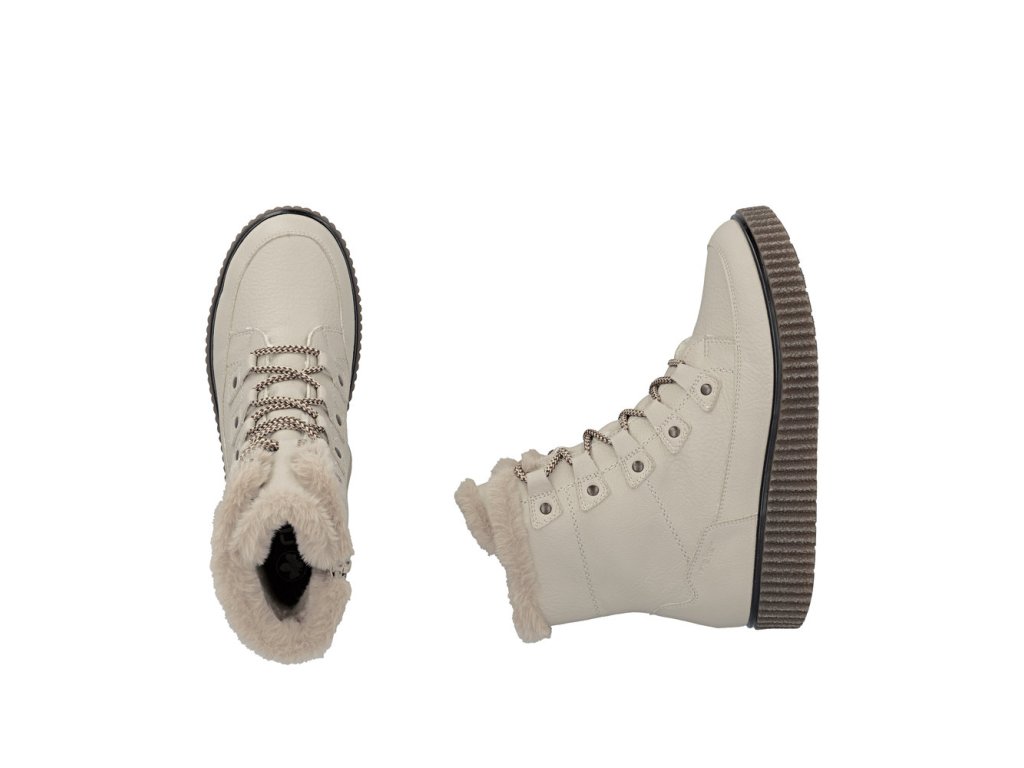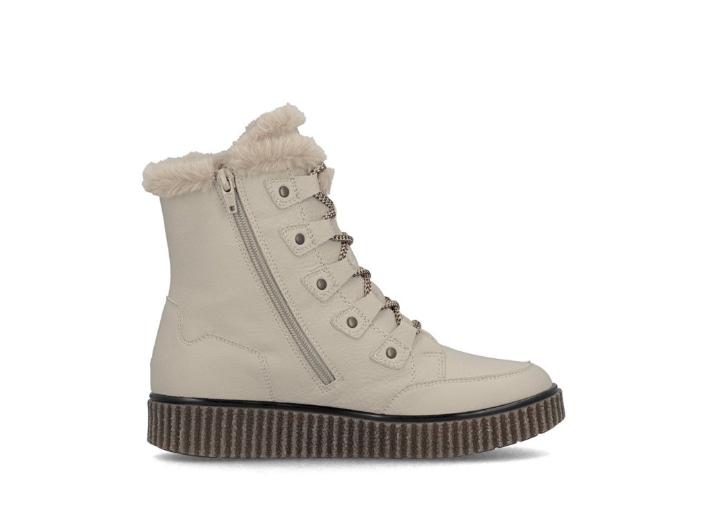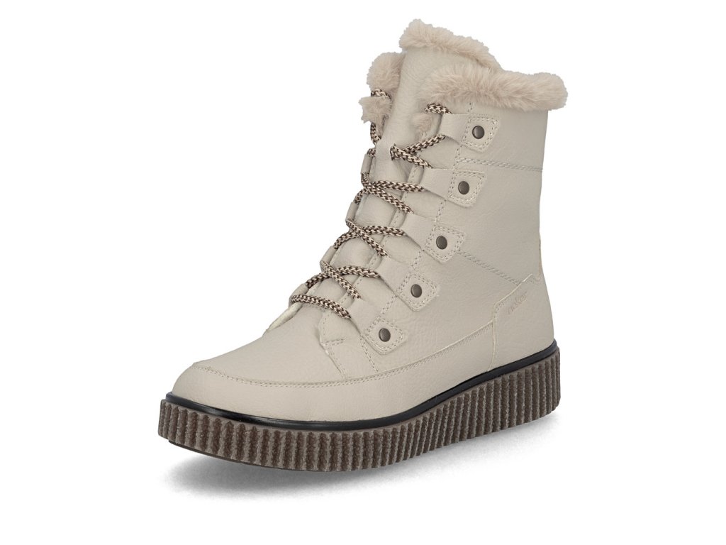 Tyto kotníkové boty značky Rieker svým provedení svršku béžové barvy budou univerzálním obutím zimních dní. Nápaditý akcent je lemování horního okraje kožíškem a linie prošití vytvoří jemnou dekoraci vzhledu. K obutí můžete využít šněrování nebo zip na vnitřní straně boty ideální pro rychlé nazutí. Měkká vyjímatelná stélka, hřejivá podšívka a podešev tlumící nárazy dělají z tohoto modelu ideálního společníka pro zimní procházky i každodenní nošení.