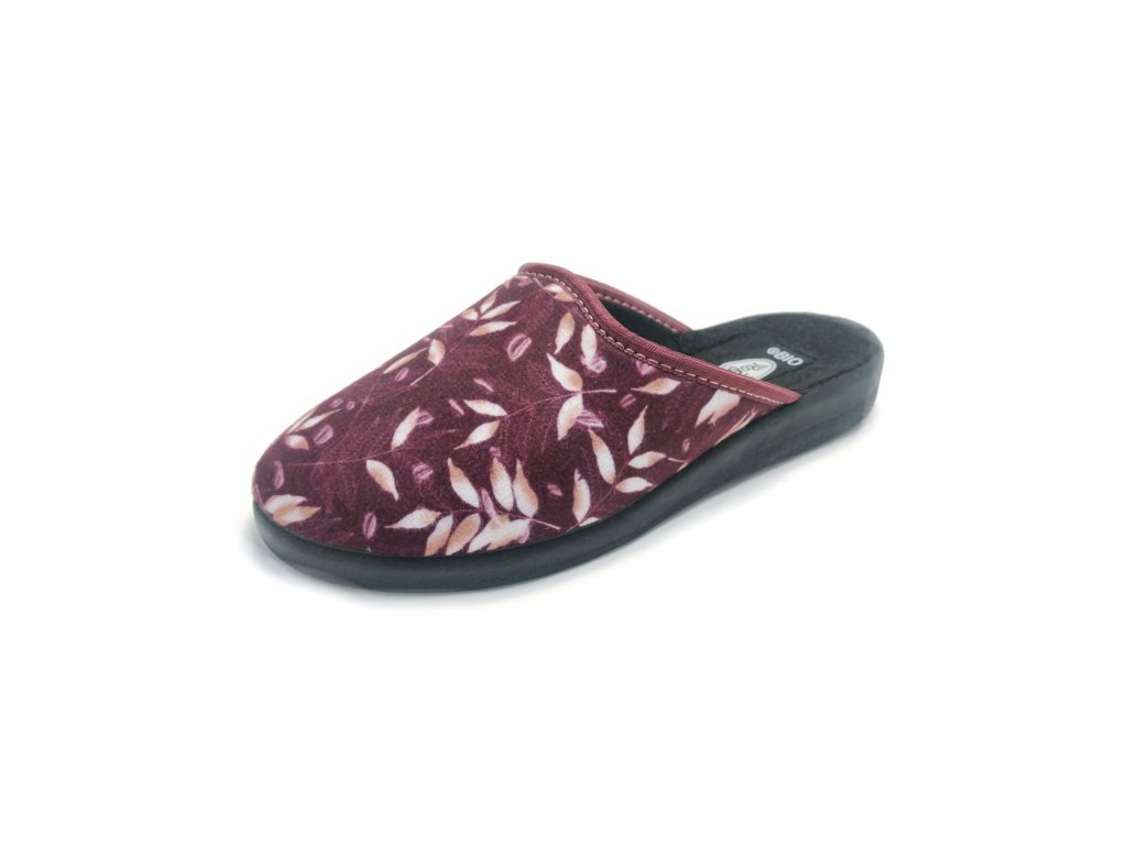 Dámské pantofle s uzavřenou špičkou a odlehčenou podešví. Vrchní textilní materiál v bordó barvě s květinovým vzorem.