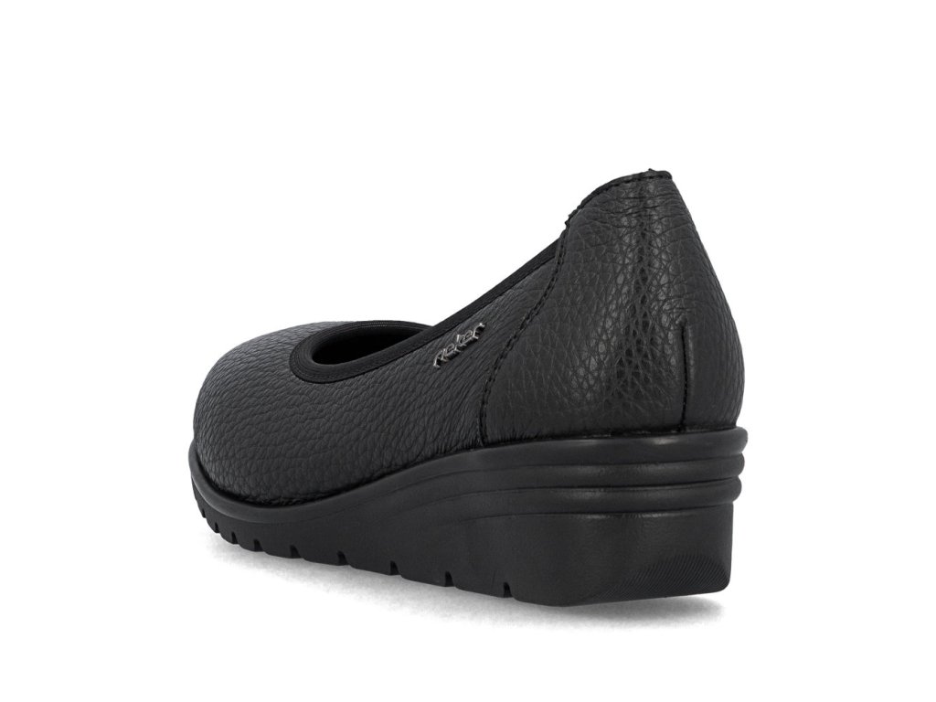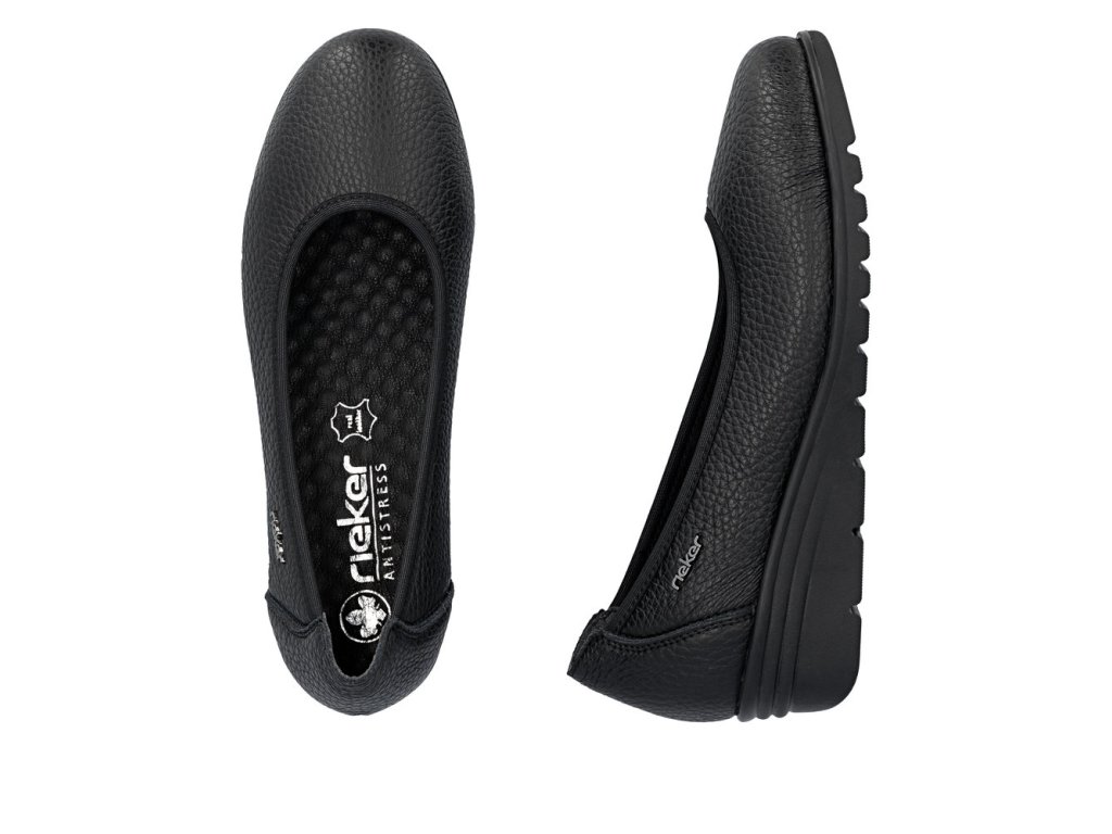 Tento nadčasový model balerín značky RIEKER je ideálním doplňkem do šatníku každé praktické ženy. Černý kožený svršek působí elegantně a univerzálně, přičemž decentní logo značky dodává jemný nádech originality. Vnitřní kožená stélka je navržena s důrazem na pohodlí – její jemná masážní úprava poskytne příjemný pocit při každém kroku a klínový podpatek nejen zvýrazní ženskou siluetu, ale zároveň zajistí pohodlí během celodenního nošení. Tyto baleríny jsou výbornou volbou na běžné dny, ale také na příležitosti, kdy chcete vypadat žensky a zároveň se cítit pohodlně.
