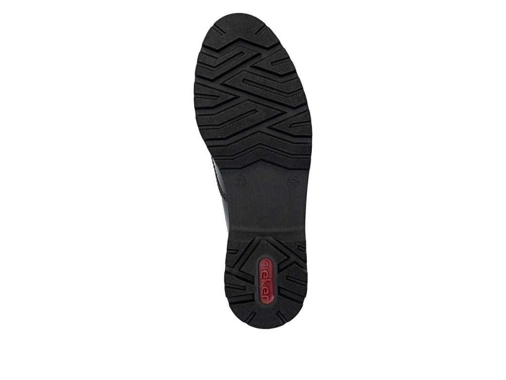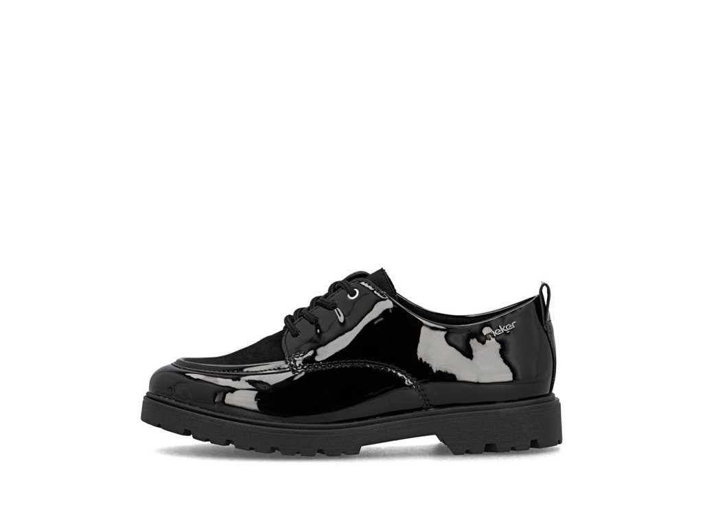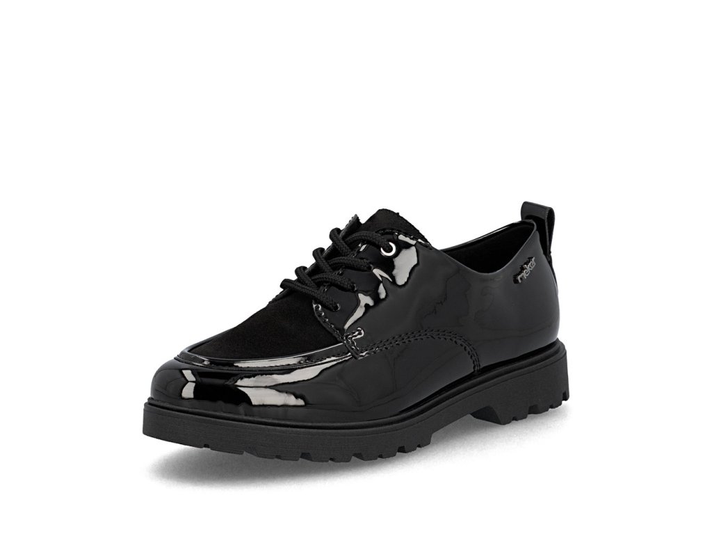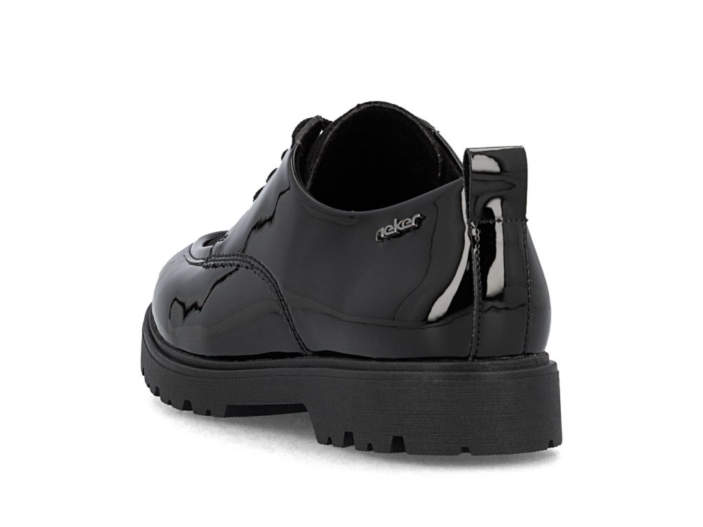 Tyto boty RIEKER v elegantní černé lakované úpravě působí velice stylově a logo značky zvýrazní jejich jedinečnost. Šněrování zajišťuje dokonalé přizpůsobení boty noze, zatímco mohutnější podešev nejen přidává na stabilitě, ale také na moderním vzhledu bot. Vnitřek boty je vybaven příjemnou koženou stélkou, která poskytuje komfort při každém kroku. Tento model je ideální pro ženy, které hledají kombinaci stylu, pohodlí a praktičnosti pro každý den.