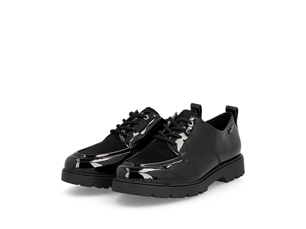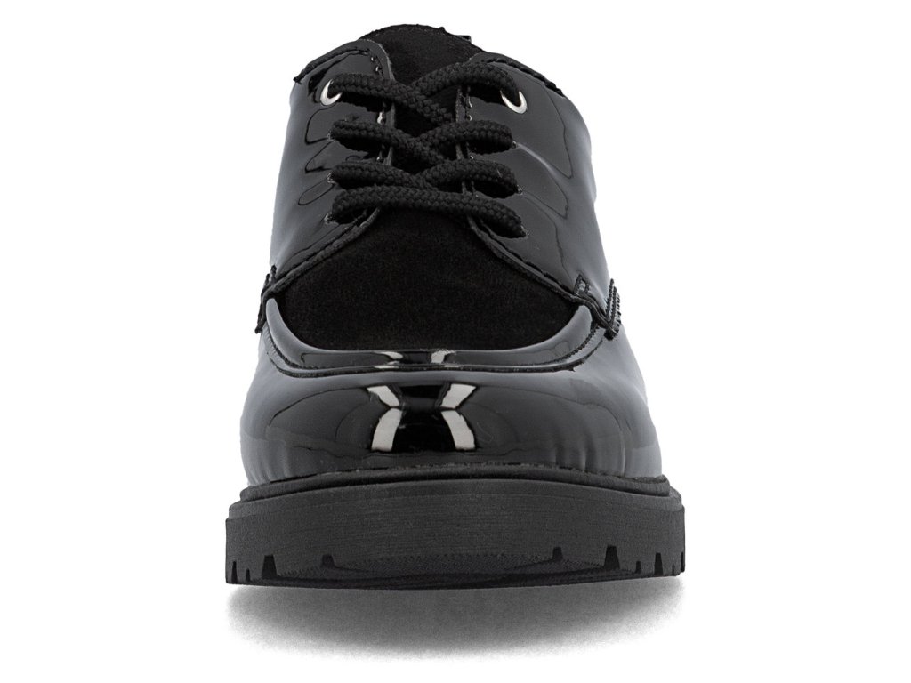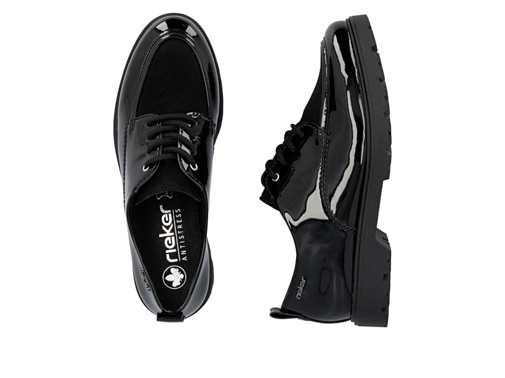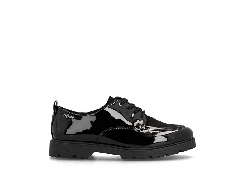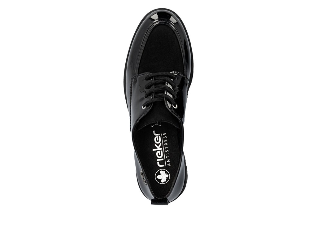 Tyto boty RIEKER v elegantní černé lakované úpravě působí velice stylově a logo značky zvýrazní jejich jedinečnost. Šněrování zajišťuje dokonalé přizpůsobení boty noze, zatímco mohutnější podešev nejen přidává na stabilitě, ale také na moderním vzhledu bot. Vnitřek boty je vybaven příjemnou koženou stélkou, která poskytuje komfort při každém kroku. Tento model je ideální pro ženy, které hledají kombinaci stylu, pohodlí a praktičnosti pro každý den.