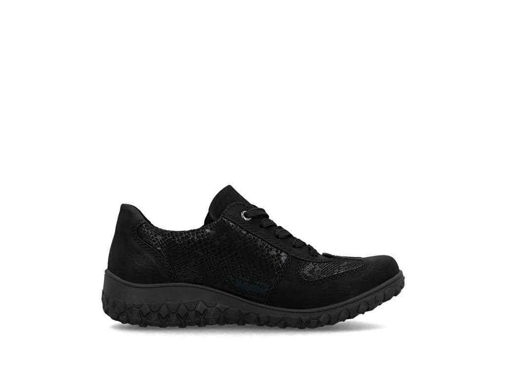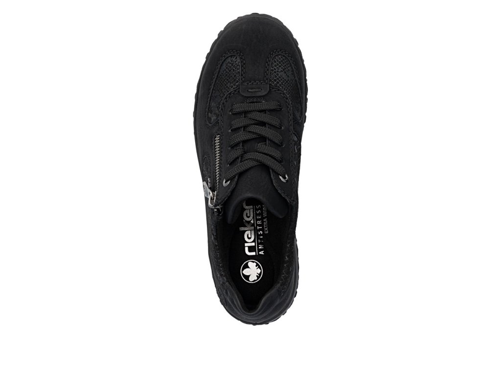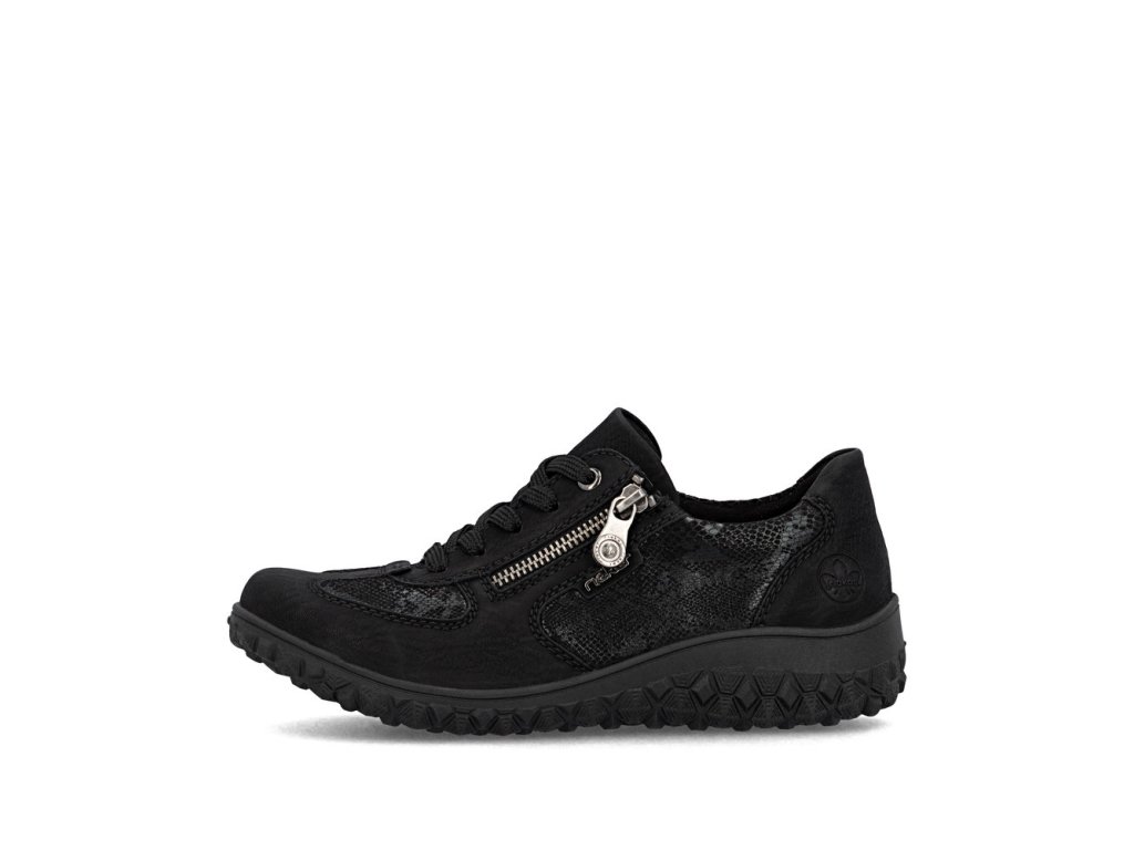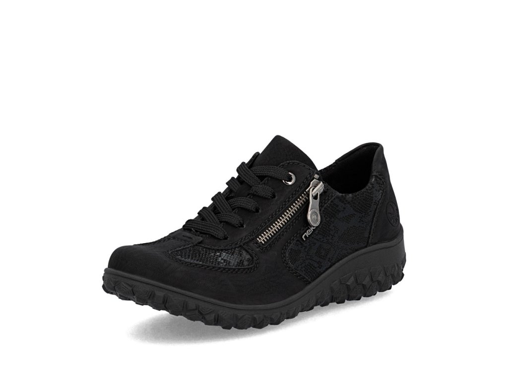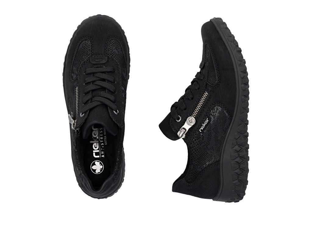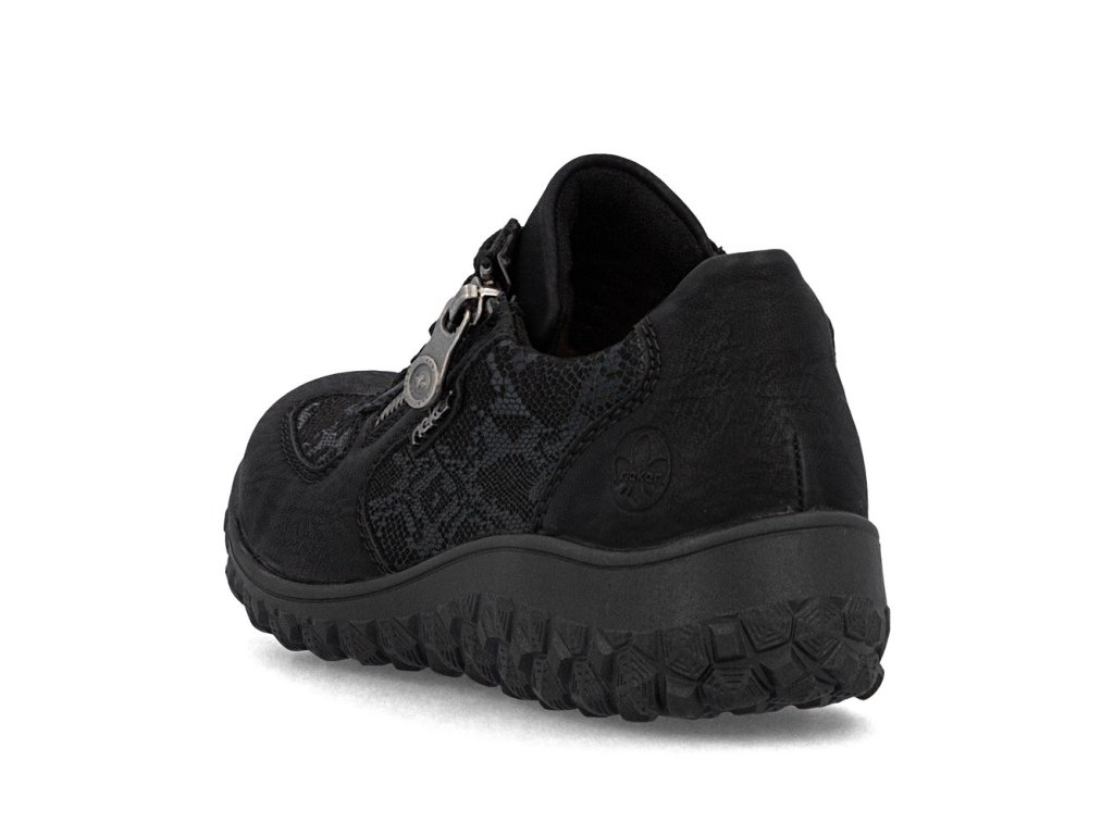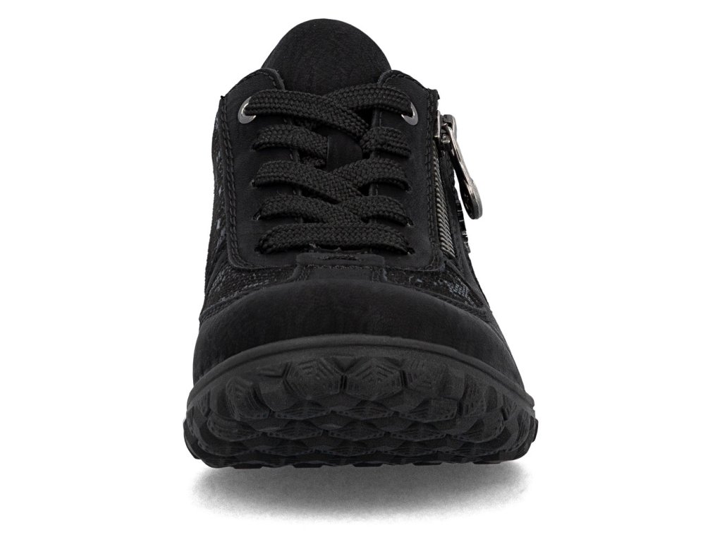 Tyto boty RIEKER jsou dokonalým spojením módního výrazu a praktičnosti. Svršek v kombinaci různých materiálů oživený zajímavým motivem dodává modelu trendový vzhled doplněný o ikonické logo značky. Funkční zip v oblasti nártu usnadňuje obutí, zatímco šněrování umožní individuální přizpůsobení boty. Měkká vyjímatelná stélka vhodná pro širší chodidlo a lehká flexibilní podešev zajistí pohodlí během celého dne. Ideální obuv pro ženy, které chtějí vyniknout bez kompromisů v pohodlí.
