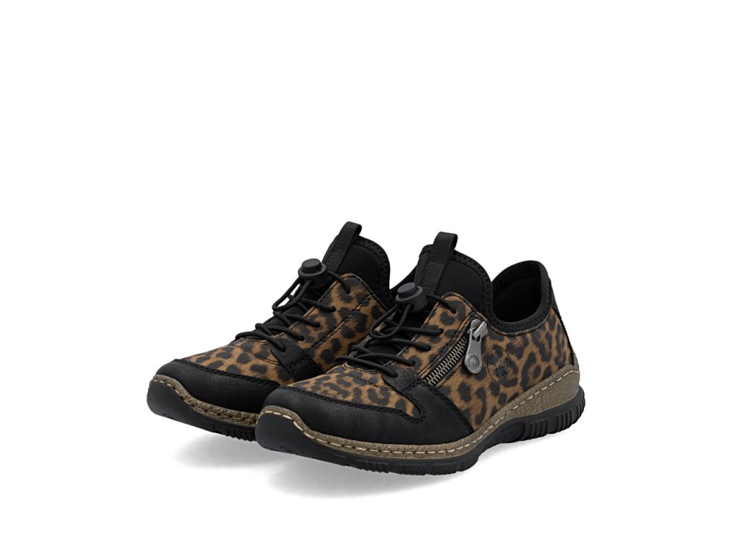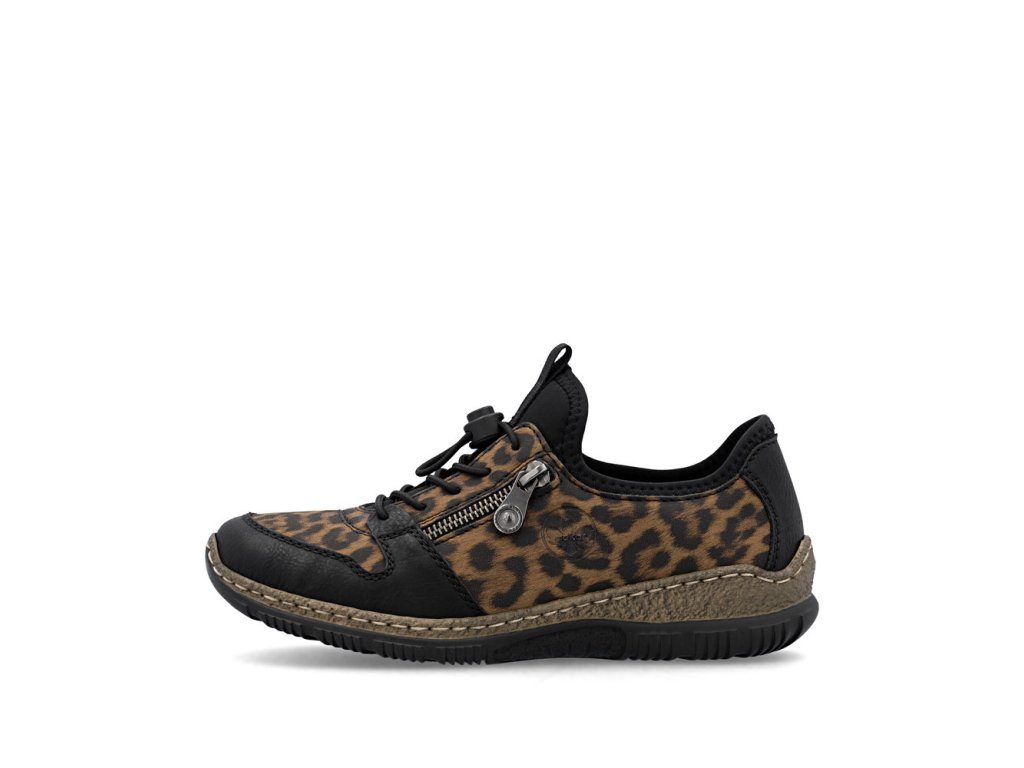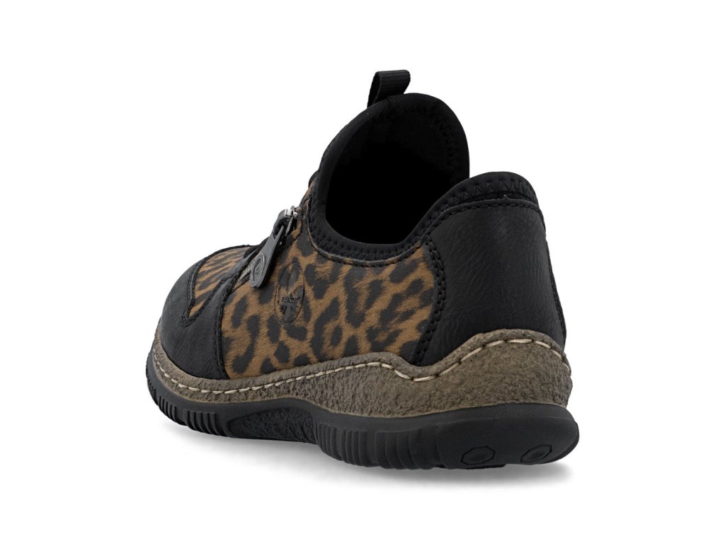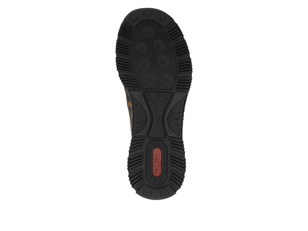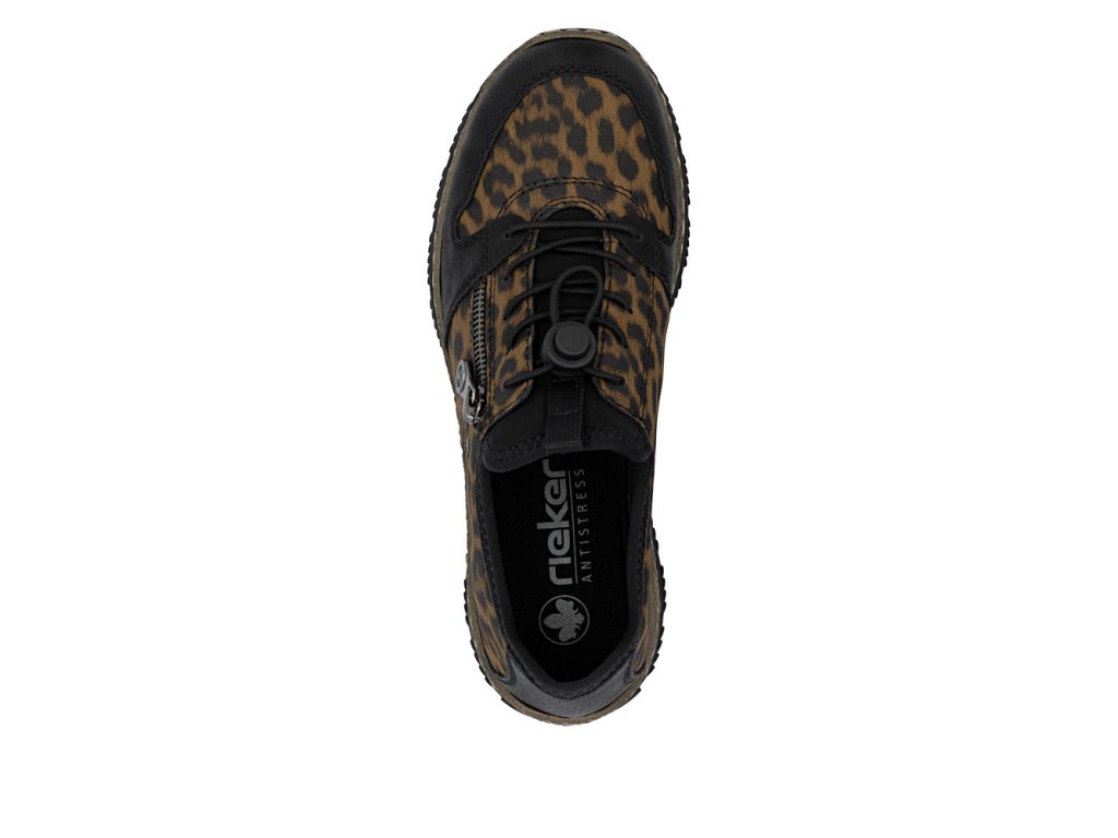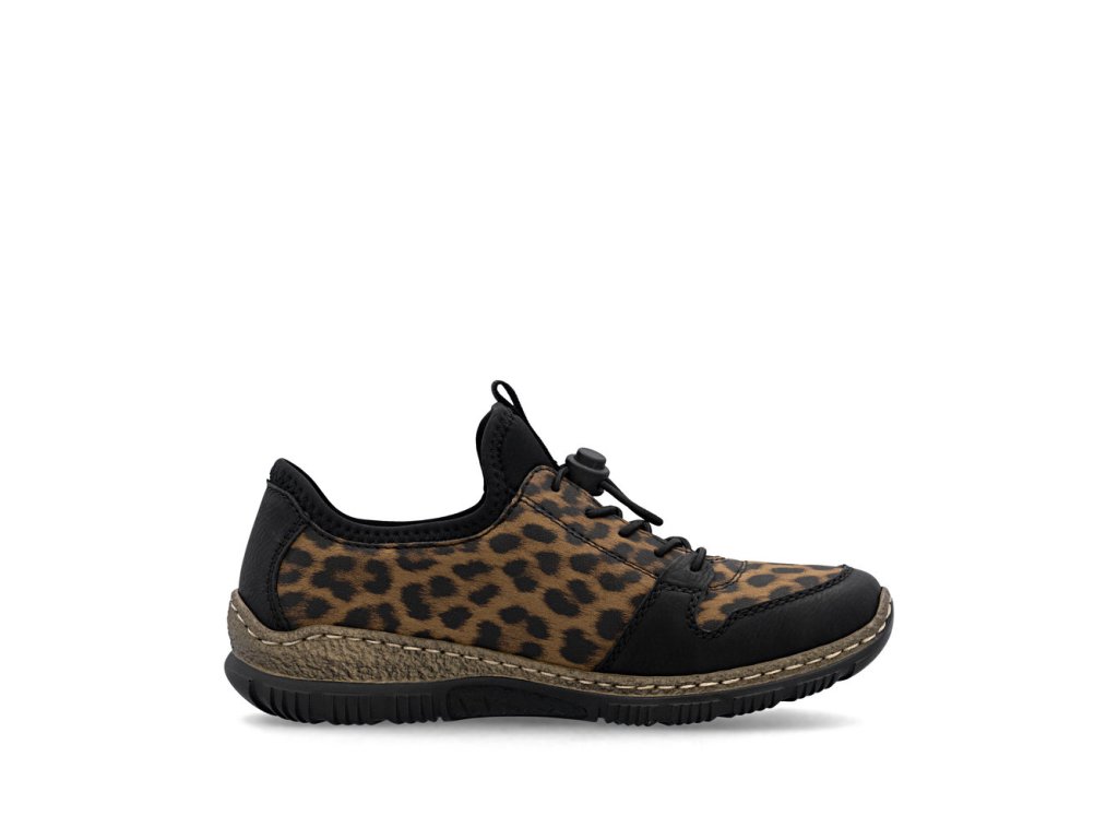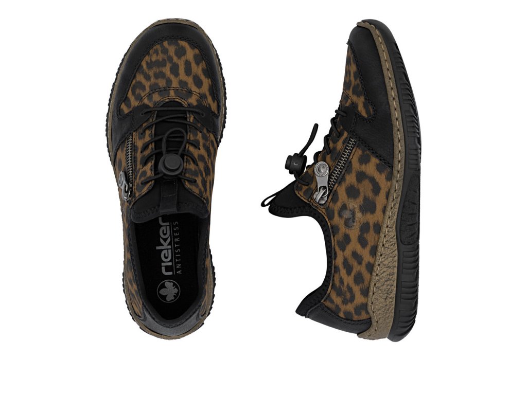 Těmto teniskám RIEKER dominuje výrazný zvířecí vzor, ??který v kombinaci s černými detaily, logem značky a dekoračním zipem vytváří originální vzhled. Obouvání usnadňuje pružný horní lem, zatímco stahovací prvek s gumičkou slouží jako efektní doplněk celkového vzhledu. Měkká stélka s paměťovou pěnou se přizpůsobí tvaru vašeho chodidla a poskytne vyjímečný komfort při každém kroku, dalším komfortním prvkem je působivě zpracovaná podešev tlumící nárazy při chůzi. Díky těmto botám se budete cítit sebevědomě a pohodlně ve všech situacích, a to i po dlouhých hodinách nošení.