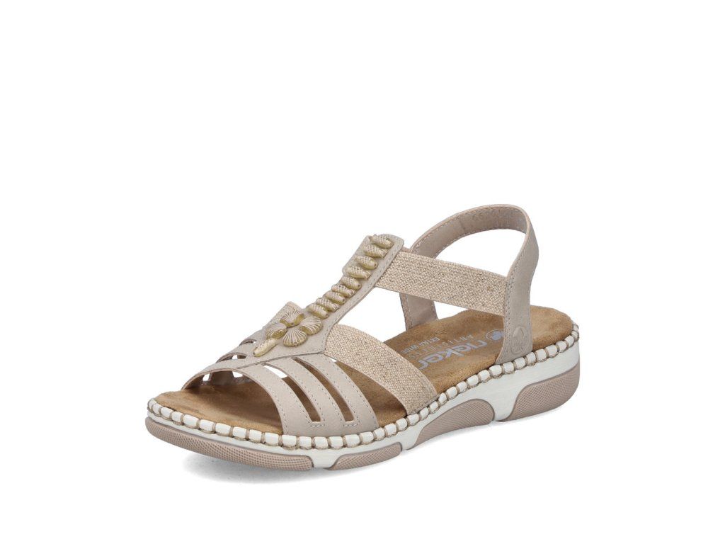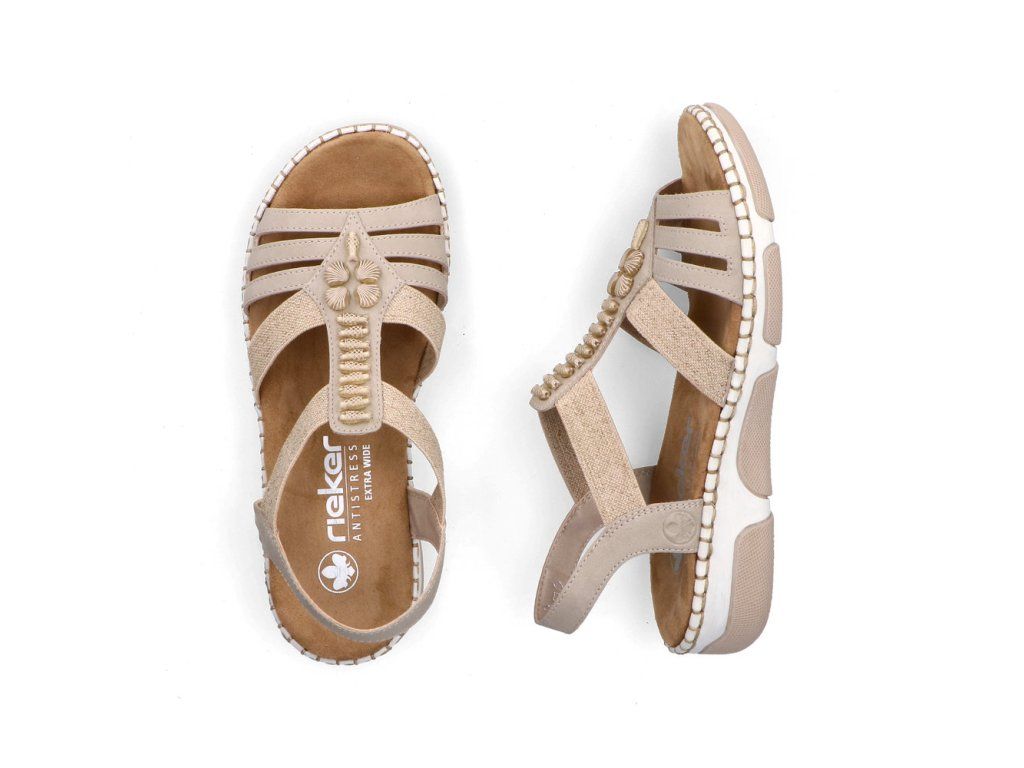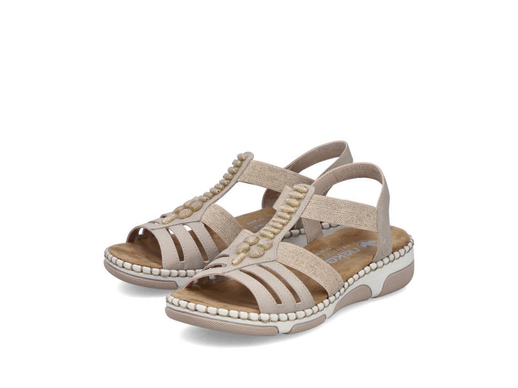 Pohodlí v módním stylu značky RIEKER – přesně to přinášejí tyto sandály. Svršek je tvořen promyšlenou skladbou pevných a pružných pásků, které se dokonale přizpůsobí tvaru chodidla a při chůzi poskytnou potřebnou stabilitu. Středovou část nártu zdobí půvabné aplikace evokující léto a moře, které sandálům dodávají jedinečný nádech. Uvnitř se nachází textilní stélka, která je příjemná na dotek a širší střih poskytne dostatek prostoru chodidlu. Sandály doplňuje vyšší podešev, která zajišťuje oporu a zvyšuje pohodlí při chůzi. Tyto sandály jsou ideální pro celodenní nošení – do města, do práce i pro volný čas.