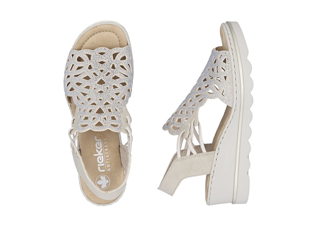 Sandálům RIEKER s béžovým svrškem zkrátka neodoláte! Zdobí je elegantní perforace doplněná třpytivými kamínky, které dodávají botám jemný lesk a elegantní výraz. Díky bočním gumičkám se snadno obouvají a skvěle drží na noze. Vyšší podešev nejen stylově vypadá, ale také efektivně tlumí nárazy při chůzi a příjemná stélka přináší příjemný došlap, díky těmto komfortním prvkům jsou tyto sandály ideální pro celodenní nošení. Výborně se hodí jak pro všední dny, tak pro speciální příležitosti, kdy chcete vypadat elegantně a cítit se pohodlně.