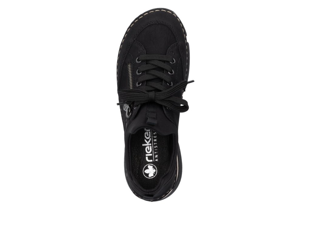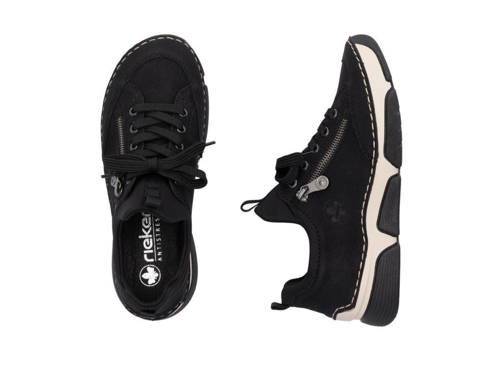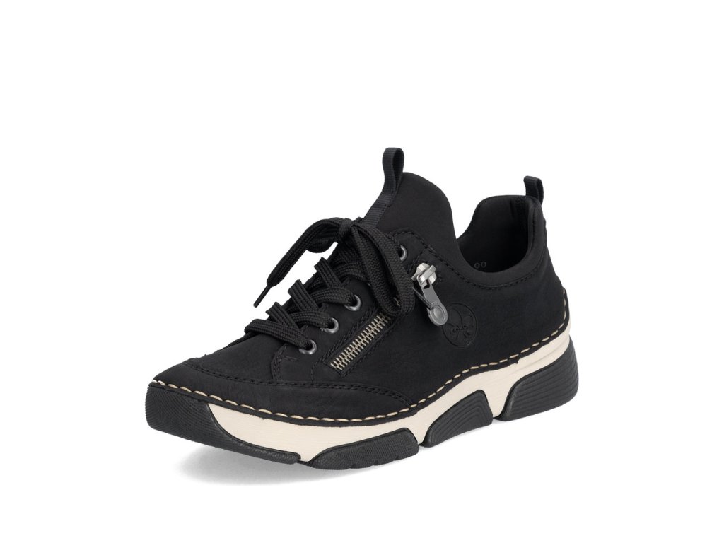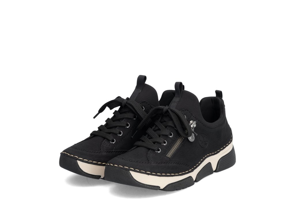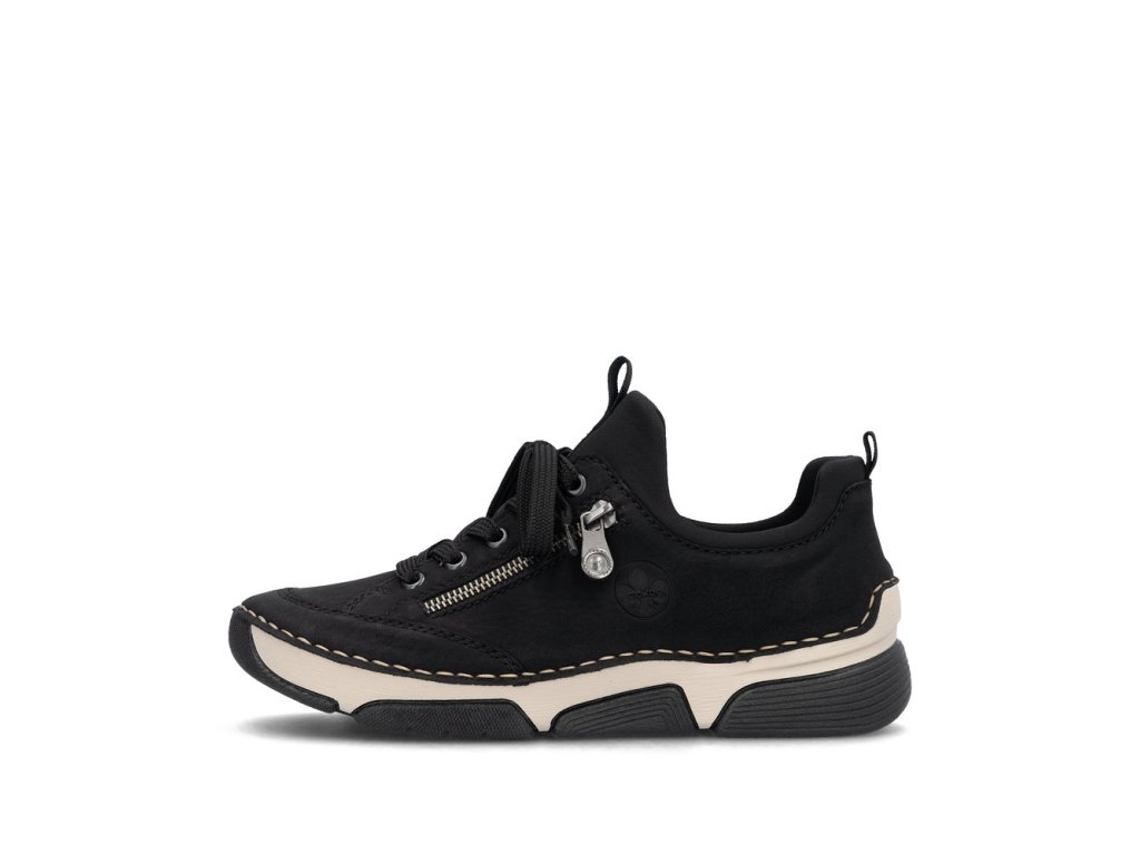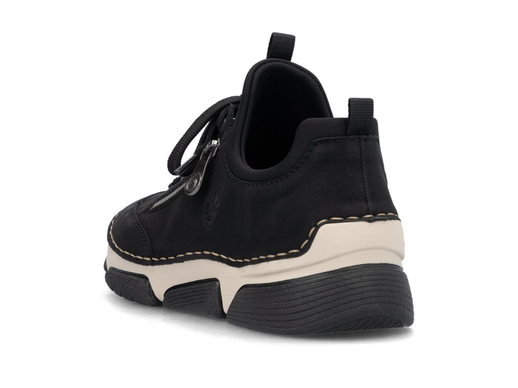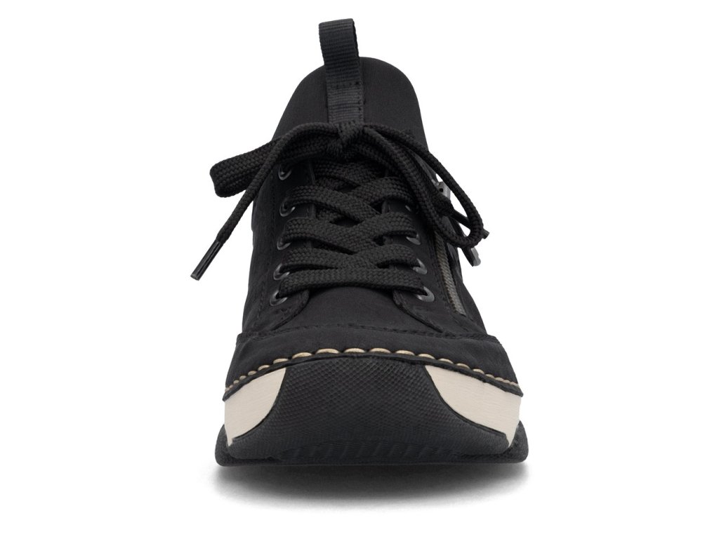 Tyto tenisky RIEKER v sobě spojují moderní design a funkční prvky, které oceníte při každodenním nošení. Svršek černé barvy je oživen ozdobným zipem a decentním logem značky, což dodává modelu stylový městský charakter. Měkký lem kolem kotníku v kombinaci se šněrováním zajišťuje výborné přizpůsobení noze a snadné obouvání. Celodenní komfort poskytne kožená vyjímatelná stélka, zatímco podešev s tlumící technologií snižuje nárazy a přispívá k celkové stabilitě při chůzi. Tento univerzální model je ideální volbou pro ženy, které hledají obuv s důrazem na komfort, styl a praktičnost – ať už se vypravíte do práce, do města nebo na procházku.