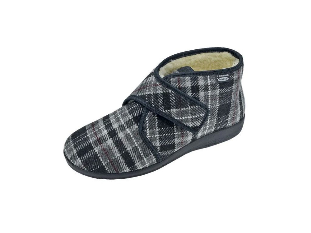 Pánské bačkory s anatomicky tvarovanou stélkou a podrážkou z PU, která je lehká a nezanechává čáry na podlaze. Bačkory jsou uzavřené, kotníčkové, zapínání přeskou na suchý zip. Bačkory jsou zatepleny pravou ovčí vlnou a mají velmi oblíbený kostkovaný vzor.