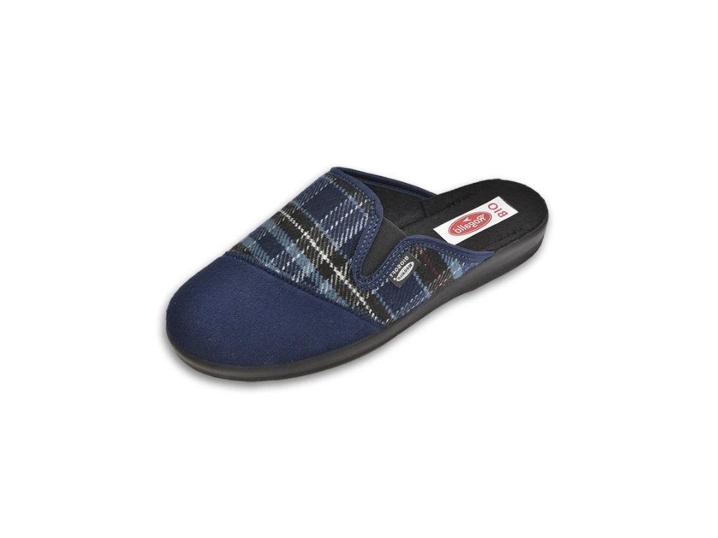Domácí pantofle s uzavřenou špičkou z textilního materiálu. Bačkory mají anatomicky tvarovanou stélku a podrážku z PU, která nezanechává čáry na podlaze. Boty jsou v modré barvě, v kombinaci s kostkou. Na straně mají všitou gumičku, díky které se poddají i širší noze.